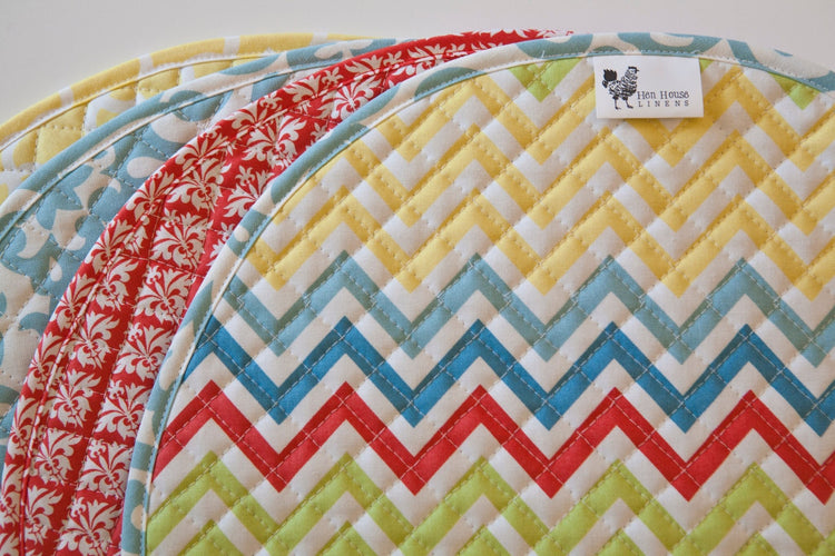 print and solid dinner napkins, placemats, quilted placemats, tablecloths, table runners, cocktail napkins, napkin rings, aprons, pillows, oven mitts, and potholders.