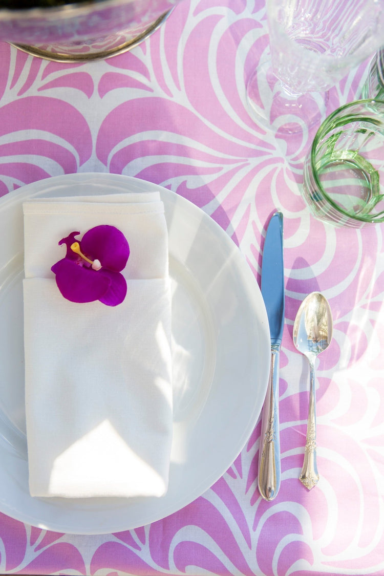 Not your grandmother's floral…our pattern Nouveau orchid is a fresh twist on a tablecloth classic. Go for a monochromatic look with our other orchid hued items or mix and match it with Lantern Grass, Bargello Grass, Greek Key Aqua, or Lantern Navy. Bloomin' gorgeous.