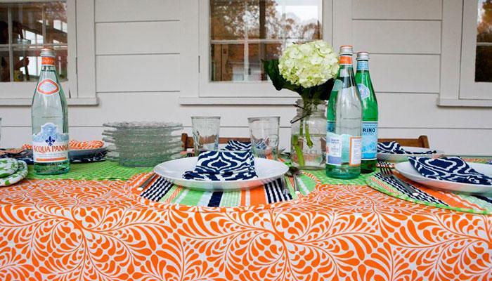 print and solid dinner napkins, placemats, quilted placemats, tablecloths, table runners, cocktail napkins, napkin rings, aprons, pillows, oven mitts, and potholders.