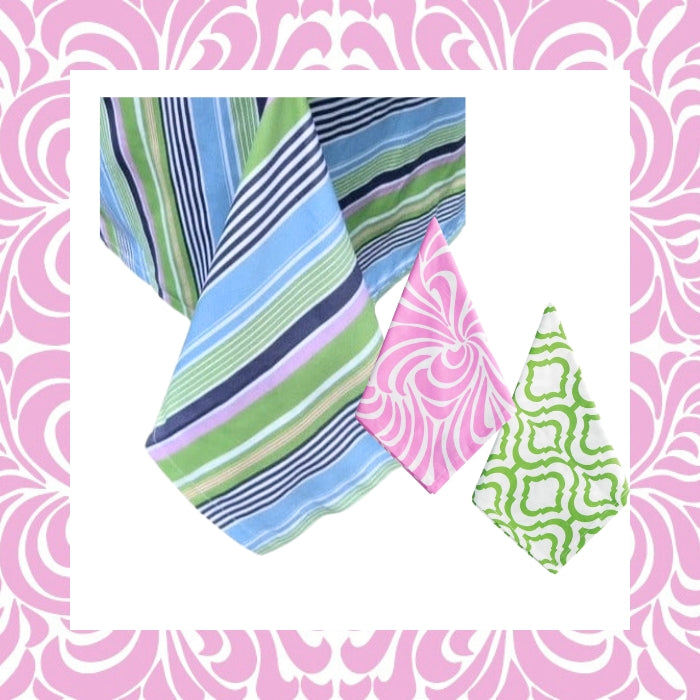 print and solid dinner napkins, placemats, quilted placemats, tablecloths, table runners, cocktail napkins, napkin rings, aprons, pillows, oven mitts, and potholders.