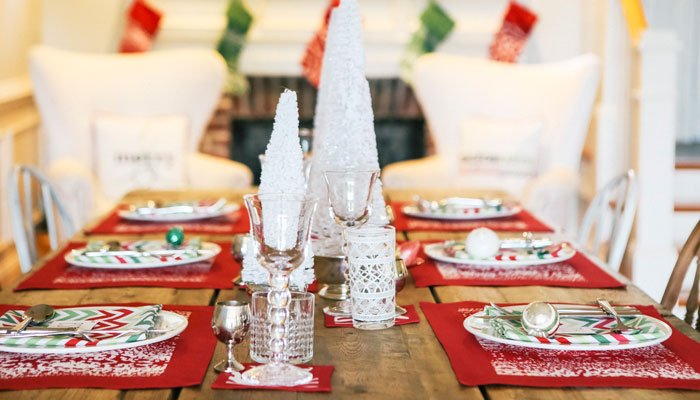 Our modern snowfall and chevron holiday red + green are the perfect compliment to this rustic farm table. With our 100% cotton eversible placemats and cloth dinner napkins, your holiday entertaining will be effortless and stress-free!