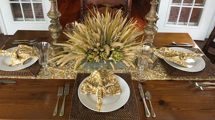 print and solid dinner napkins, placemats, quilted placemats, tablecloths, table runners, cocktail napkins, napkin rings, aprons, pillows, oven mitts, and potholders.